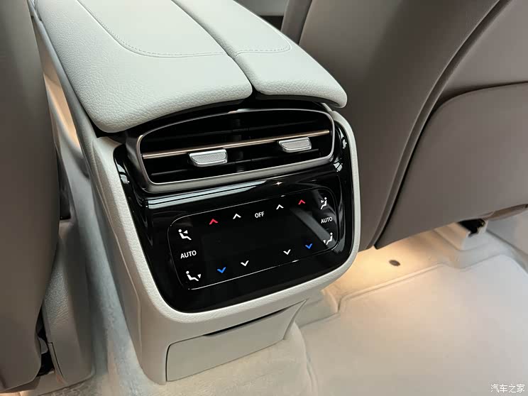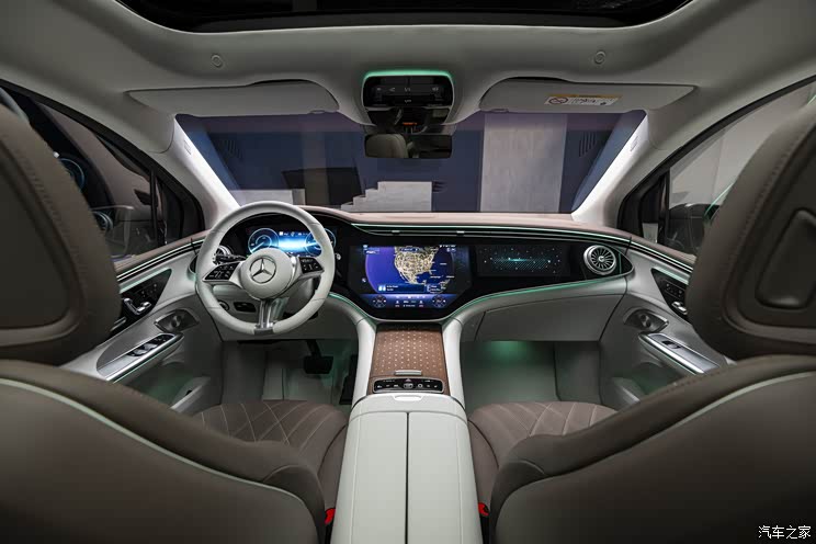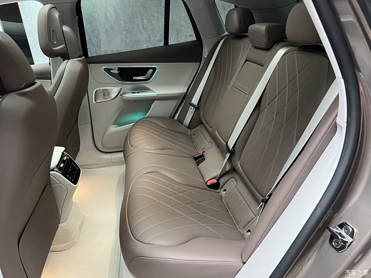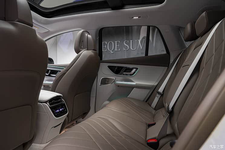 新車搭載瞭分段式的大尺寸天窗,得益於SUV高大的車身,它的後排擁有更寬敞的空間,我們註意到它後排地板相比於轎車也更加的平整。此外,它的中央扶手後方設計與EQE轎車保持一致,擁有空調獨立控制系統。