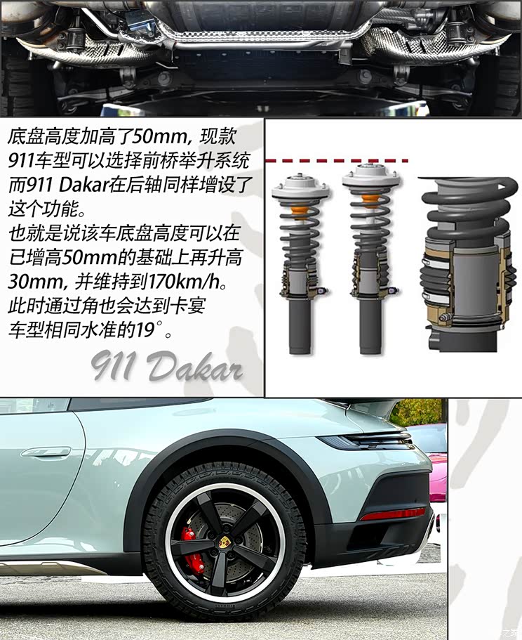 底盤方面,新車車身高度提升50mm,標配可將車頭和車尾提升30mm的升降系統,整車最大離地間隙可達191毫米。這項升降系統的設計理念不僅是為瞭讓車輛低速通過障礙物,更是作為重新調校的懸架的一個組成部分。在“高位”設置下,車輛能以高達170km/h的速度展在非鋪裝路面高速行駛,而當車速超過170km/h,車輛將自動降低高度至“標準”位置。