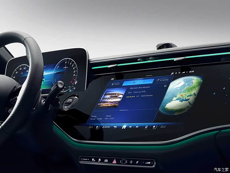 第三代MBUX智能人機交互系統應用瞭新開發的兼容層,搭載瞭更多第三方車載應用,實現更豐富的內容生態,如:刷抖音、玩遊戲,或是利用車內攝像頭進入視頻會議等 。同時,全新E級車支持數字汽車鑰匙,車主可以僅使用智能手機開啟或關閉車輛。此外,全新E級車率先引入“場景”功能,比如,客戶將一個“場景”功能的觸發條件設置為“低於12度”,當車輛監測到環境溫度低於觸發值時,則自動開啟座椅加熱並將氛圍燈調至暖色。