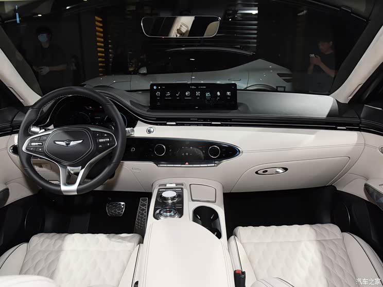進入到車內,新車整體內飾與GV80有一定相似度,不過更多應用瞭曲線線條,使其在保持豪華感的同時也提升瞭時尚感。方向盤采用瞭圓形三輻式設計,左邊的多功能按鍵負責控制多媒體,右邊的負責輔助駕駛,從方向盤圖標來看該車支持ACC自適應巡航以及車道保持功能。