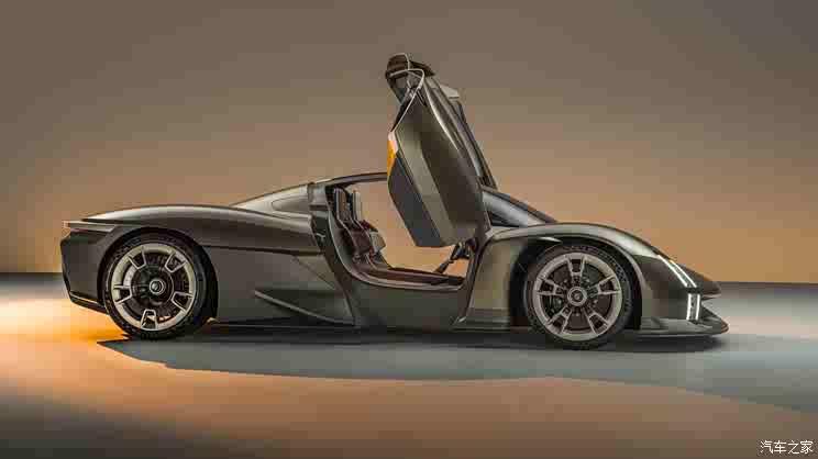 來到側面,新車擁有玻璃穹頂以及蝴蝶門開啟方式均是在向勒芒賽車表達致敬。車身尺寸方面,新車長約4.5米、寬約2米、高約1.2米,軸距2.73米,對於一款超級跑車來說,它的車身尺寸十分緊湊。另外新車還配備前20英寸、後21英寸輪圈,後輪圈還采用類似渦輪風扇狀的透明葉片,可幫助制動系統進行散熱。