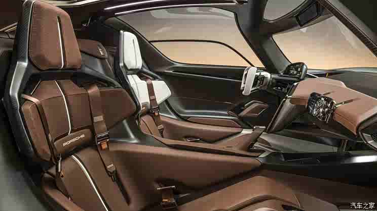 在碳纖維單體殼車架的內部,兩個桶形座椅采用不同顏色塗裝來展現保時捷以駕駛者為中心的設計理念,同時還配備六點式安全帶。主駕駛前方采用半幅式方向盤設計,另外我們還可以看到全液晶儀表以及流媒體後視鏡等設計。值得一提的是,在副駕駛前方還預留瞭電子計時表的插槽,連接後可以顯示圈速、車手數據以及其它信息等,可在場地賽或拉力賽中使用。