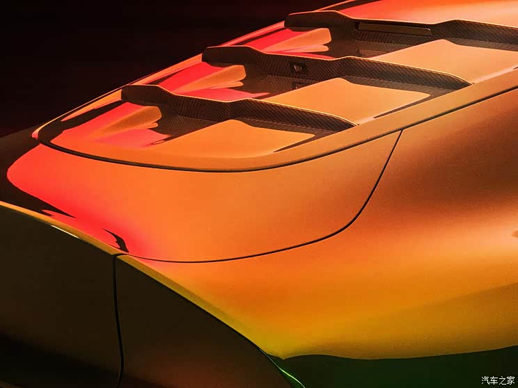 外觀方面,車頭兩側配備瞭縱向佈局的大燈組,內部采用瞭雙條幅的LED日間行車燈設計,該燈組樣式的設計靈感來自飛機機翼。此外,新車前包圍同樣為三分式設計,尺寸誇張的導流槽預計能夠大幅優化車輛的空氣動力學表現。此外,發動機蓋上犀利的三角形進氣口格外吸睛。