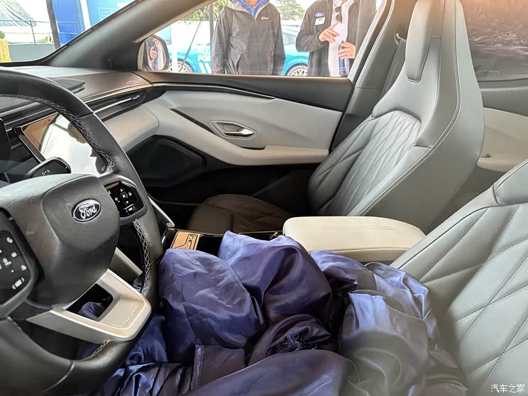 在車內,這款車使用瞭15英寸Ford Sync Move中央觸摸屏,如同它名字中的“Move”,這是一個可以上升和下降的屏幕。 屏幕下方島臺上設置有觸控按鍵,可以控制音量等。該車配備有無鑰匙進入、雙區自動空調、無線Android Auto和 Apple CarPlay、10色氛圍燈等。在中控正上方還有一條亮眼的氛圍燈,這其實是一個Sound Bar條形音響。