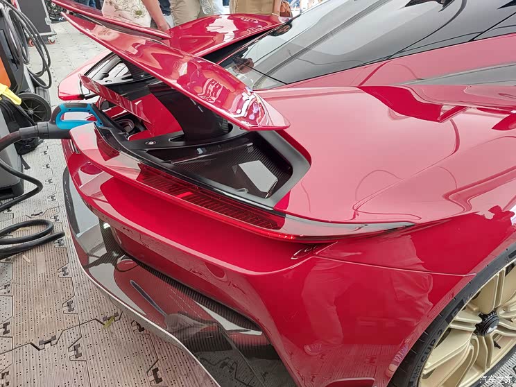 新車采用瞭超跑上常見的蝴蝶門,配合定制的大尺寸金色輪圈,看上去非常拉風。後輪附近也能看到碳纖維定風翼,加上白色的拉花,渲染出濃鬱的賽車氛圍。作為一款電動超跑,新車在車門後部仍然設置瞭進氣口,這樣能將新鮮空氣導入車身內部,為電機和電池進行散熱。