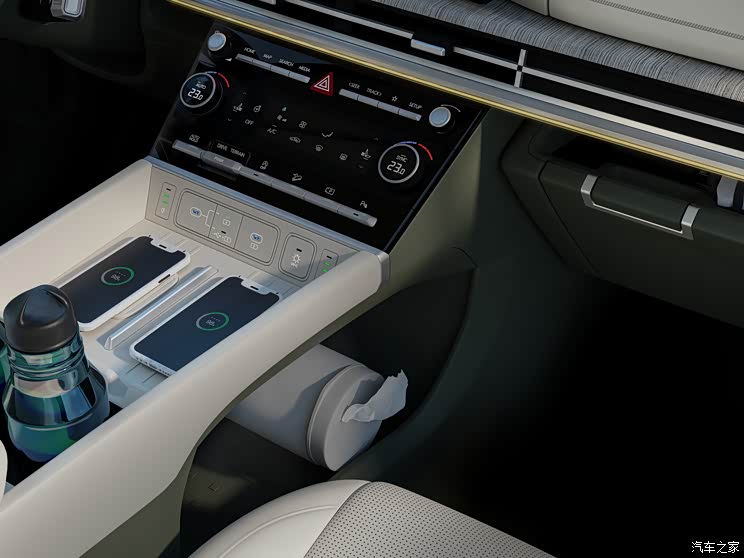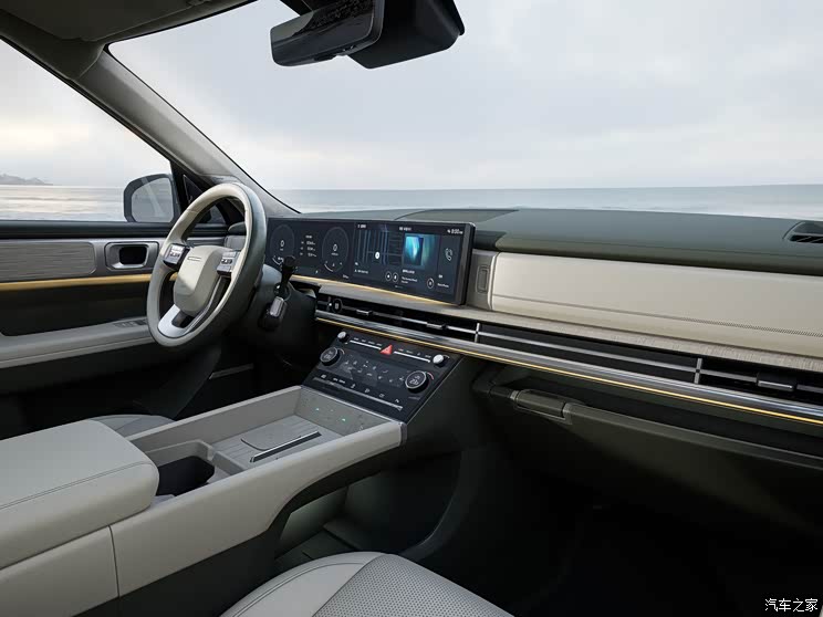 內飾方面,也同樣延續硬朗的風格,雙聯屏采用弧形的設計,屏幕有著較薄的邊框,看上去分辨率較高,內飾保留瞭大量的物理按鍵,可以控制多媒體系統和空調系統,並有獨立的顯示屏。由於采用瞭懷擋,中央保留瞭巨大的儲物空間,並包含手機無線充電。整個內飾展現出溫馨的配色,加上氛圍燈後,視覺醒目突出。