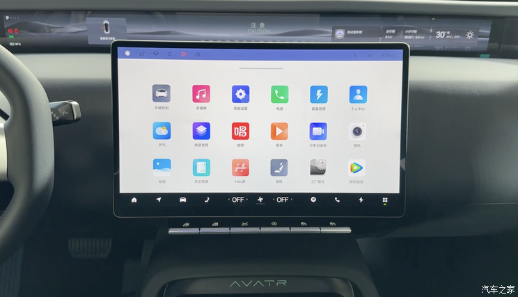 阿維塔12提供三種內飾風格可選,分別為豪華、精英、運動,座艙內35.4英寸4K全景寬屏設計,兩側為外側流媒體後視鏡的顯示屏,中央顯示部分駕駛信息等。中控部分則繼續配備一塊15.6英寸中控屏。車內還擁有27個揚聲器,64色環擁式智能氛圍燈,以及3種個性化香氛方案。