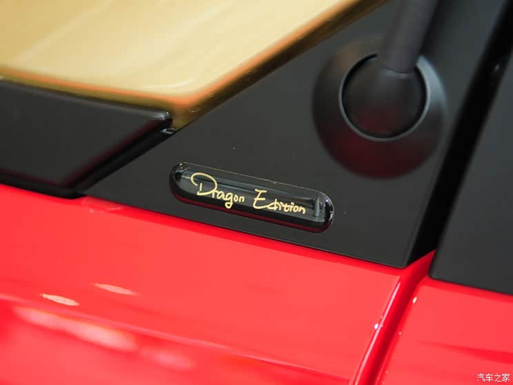 smart龍年特別版是與BRABUS博速禦用改裝團隊合作研發,外觀采用中國紅作為主色調,格柵、車身、外後視鏡以及輪圈等處則是采用金色裝飾,十分醒目。細節方面,在C柱位置我們可以看到“龍”字標識,另外尾部還配備有“Dragon Edition”專屬標識。